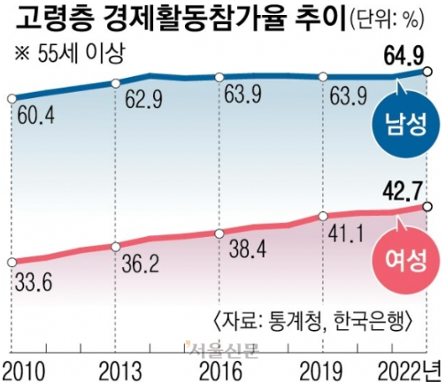 다만 고령층의 경제활동률은 여성(9.1% 포인트)이 남성(4.5% 포인트) 보다 가파르게 증가했다. 65세 이상의 경제활동률은 12년간 남성과 여성 모두 7.1% 포인트 증가했으나 65세 미만(55~64세)에서는 여성이 11.4% 포인트 증가해 상승폭이 남성 (3.7% 포인트)을 크게 앞섰다.