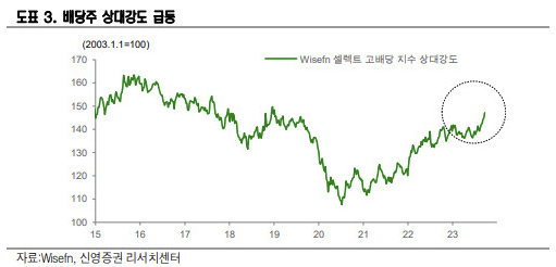 오는 10월까지는 미국채 금리 고공행진 장기화 우려로 위험자산 변동성이 이어질 것으로 전망돼, 고배당주에 집중하는 전략이 유효하다고 봤다. 채권시장과 외환시장의 선제적 안정화를 확인할 필요가 있다는 설명이다. 가치주와 배당주 상대강도도 반등하고 있다고 짚었다.