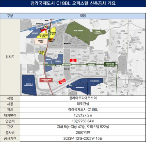 이 사업은 인천광역시 서구 청라동 6-7, 8번지 일원 인천경제자유구역 청라국제도시 C18 블록(BL) 1만 2127.2㎡에 연면적 13만 7763.34㎡, 지하 5층~ 지상 47층 규모 오피스텔 522실을 조성하는 프로젝트다. 시공은 대우건설이 맡았고 공사비는 2697억 원으로 책정됐다.