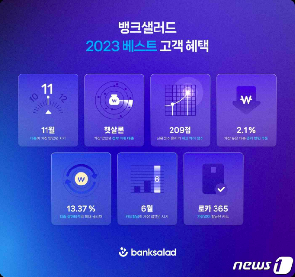 뱅크샐러드 측은 "올해 대환대출, 0.1% 무조건 금리 인하, 대출금리 할인쿠폰, 최저금리 자동조회 출시 등 다양한 대출 관련 서비스를 출시해 대출 시장에 본격 진출했다"며 "올 한 해 뱅크샐러드의 대출 실행액은 2022년 대비 10배 성장했다"라고 설명했다.