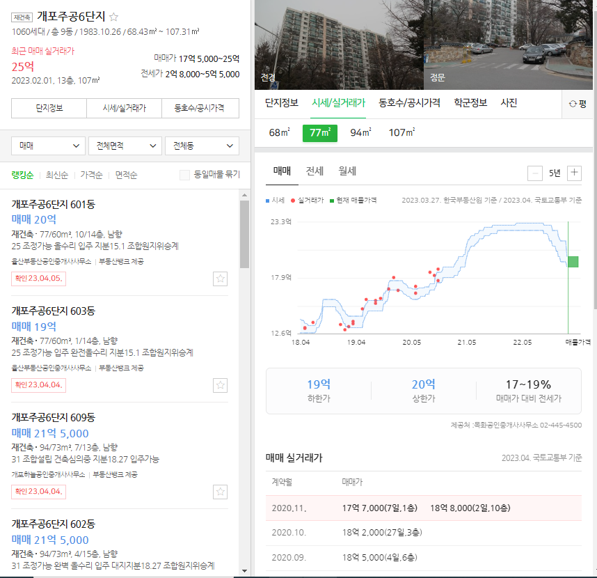 그래도 아파트 하면 서울 강남 아파트가 빠질 수 없으니까 가지고 왔는데 5년 동안에 거래가 지표를 보시면 18년 4월 13억 원으로 시작해서 21년 5월부터 22년까지 23억 원까지 갔다가 23년 3월에 20억 원에 매물이 올라와 있네요. 물론 거래량이 많지 않아 최근 정확한 데이터를 알 수 없지만....
