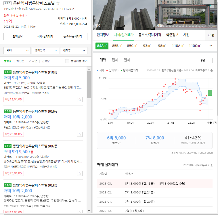 서울에 집 값이 떨어지면 수도권 지역에 영향을 미치게 되죠. 작년까지만 21년까지만 해도 10~11억 원대에 거래가 됐는데 최근 매매 거래 가는 8억 원대 하구 있네요.