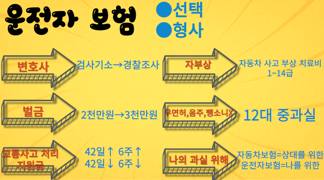 운전자 보험은 형사적 책임(벌금, 변호사 선임비용 등)을 대비하여 가입하는 보험이라고 생각하시면 됩니다.