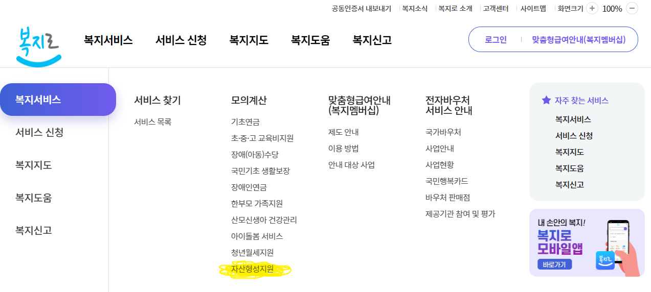 복지로 홈페이지에 들어가서 복지서비스 '자산형성지원'을 클릭하면 모의계산을 해볼 수 있습니다.